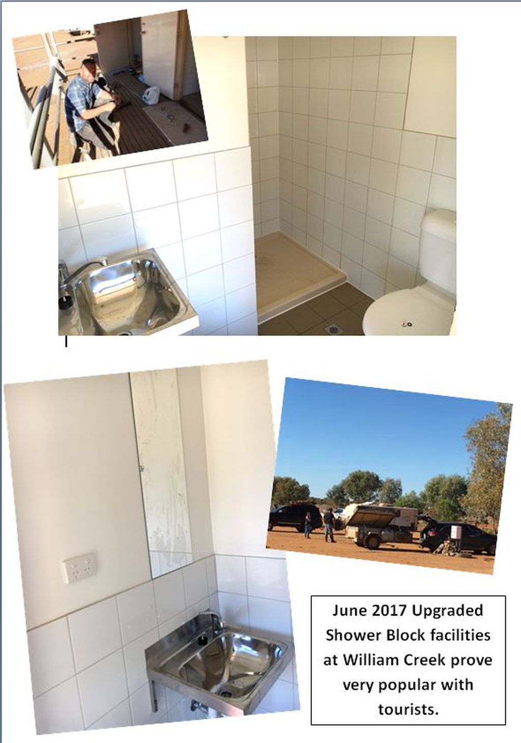Tradesmen have been busy during June 2017 upgrading the shower and toilet block at William Creek. It has proved to be very popular with tourists using the campground facilities.